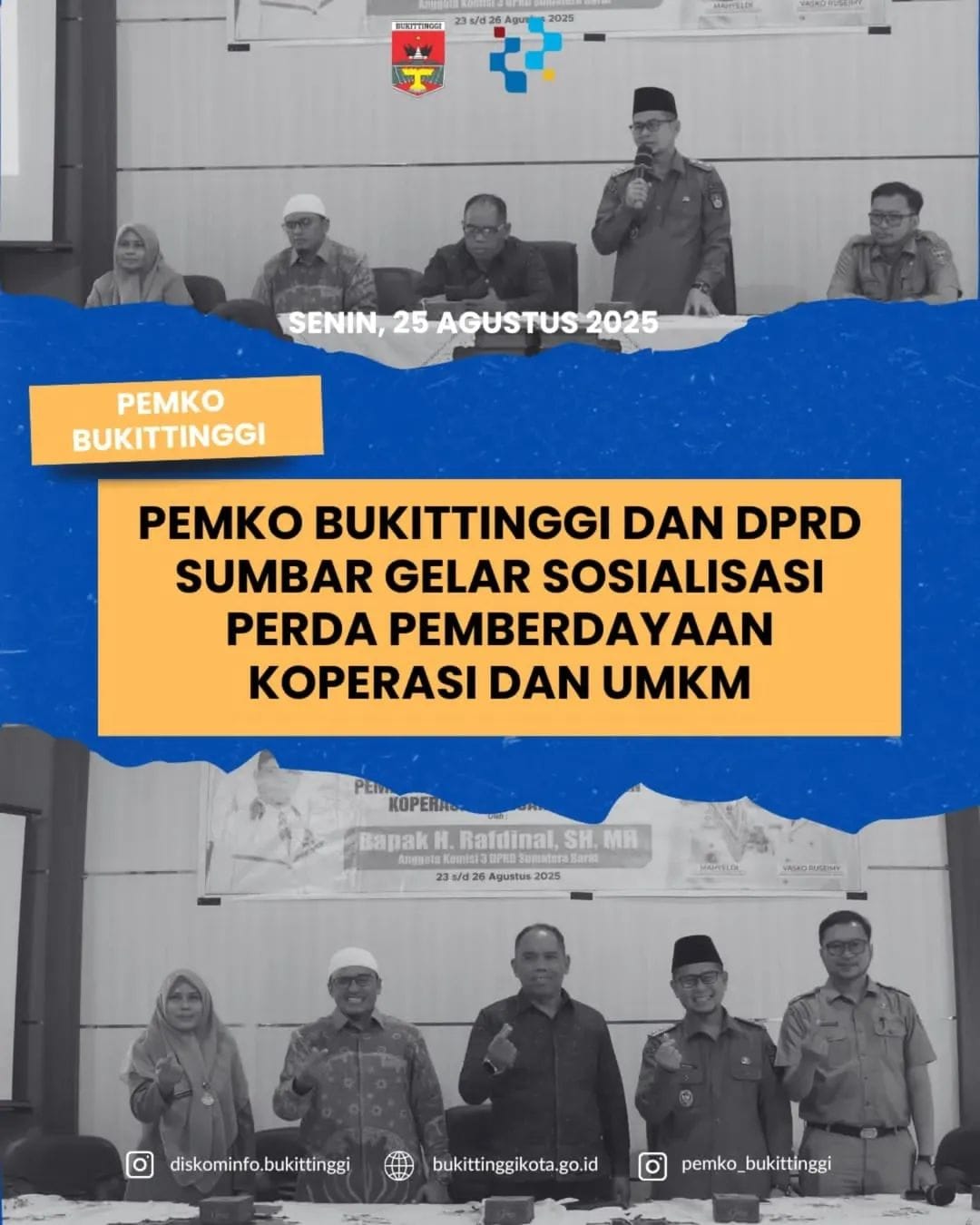 Bukittinggi,Infosumbar24.com | Pemerintah Kota Bukittinggi bersama DPRD Sumatera Barat gelar kegiatan sosialisasi Peraturan Daerah Provinsi Sumatera Barat Nomor 16 Tahun 2019 tentang Pemberdayaan dan Perlindungan Koperasi dan Usaha Kecil. Kegiatan ini berlangsung di Ruang Pertemuan Kantor Camat Guguk Panjang, Kota Bukittinggi. Senin, 25 Agustus 2025.