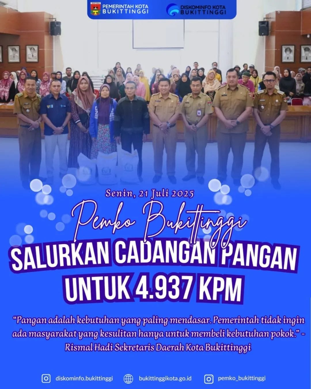 Bantuan pangan yang diberikan, berupa beras kepada 4.937 Keluarga Penerima Manfaat (KPM) di Kota Bukittinggi. Hal ini merupakan bentuk nyata kepedulian pemerintah terhadap ketahanan pangan dan kesejahteraan masyarakat.