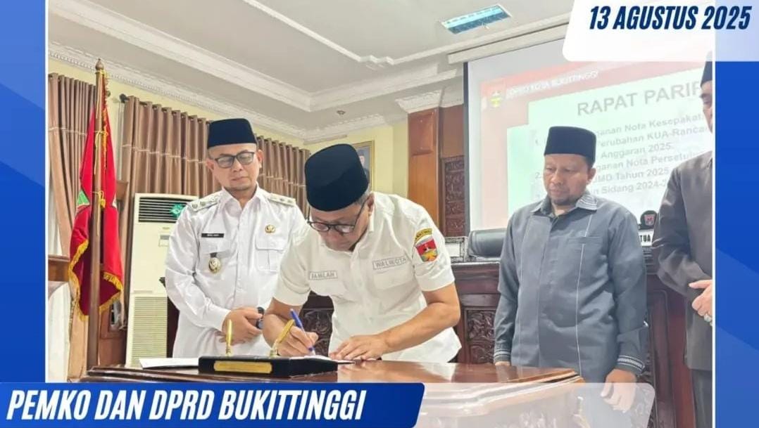 Bukittinggi,Infosumbar24.com |Pemerintah Kota Bukittinggi bersama DPRD kota Bukittinggi tandatangani Nota Kesepakatan Bersama Rancangan Perubahan KUA-Rancangan Perubahan PPAS APBD Tahun Anggaran 2025, Raperda tentang RPJMD Tahun 2025–2029 dan Tutup Tahun Sidang 2024–2025 dan Buka Tahun Sidang 2025–2026. Kegiatan ini dilaksanakan dalam rapat paripurna di DPRD Kota Bukittinggi, Rabu, 13 Agustus 2025.