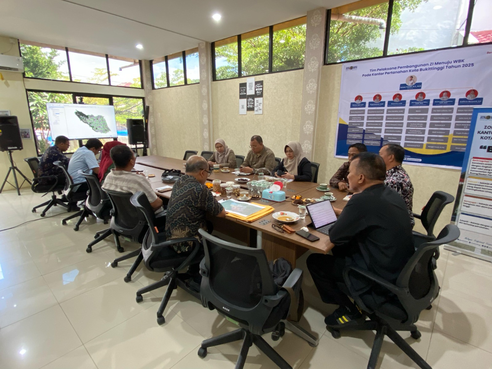 Pertemuan ini dipimpin langsung oleh Kepala Kantor Pertanahan Kota Bukittinggi, Bapak Isman Yandri, S.T., M.M., dan dihadiri oleh tim dari Seksi Survei dan Pemetaan. Agenda utama yang dibahas adalah tindak lanjut pelaksanaan Rencana Tata Ruang Wilayah (RTRW) Kota Bukittinggi, khususnya dalam hal sinkronisasi data spasial dan dukungan teknis dari sisi pertanahan.