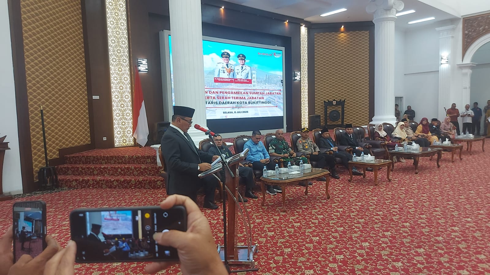 Bukittinggi,Infosumbar24.con |Wali Kota Bukittinggi, Ramlan Nurmatias, secara resmi melantik dan mengambil sumpah jabatan Rismal Hadi sebagai Sekretaris Daerah Kota Bukittinggi. Prosesi pelantikan berlangsung khidmat di Balairuang Rumah Dinas Wali Kota, Selasa, 8 Juli 2025.