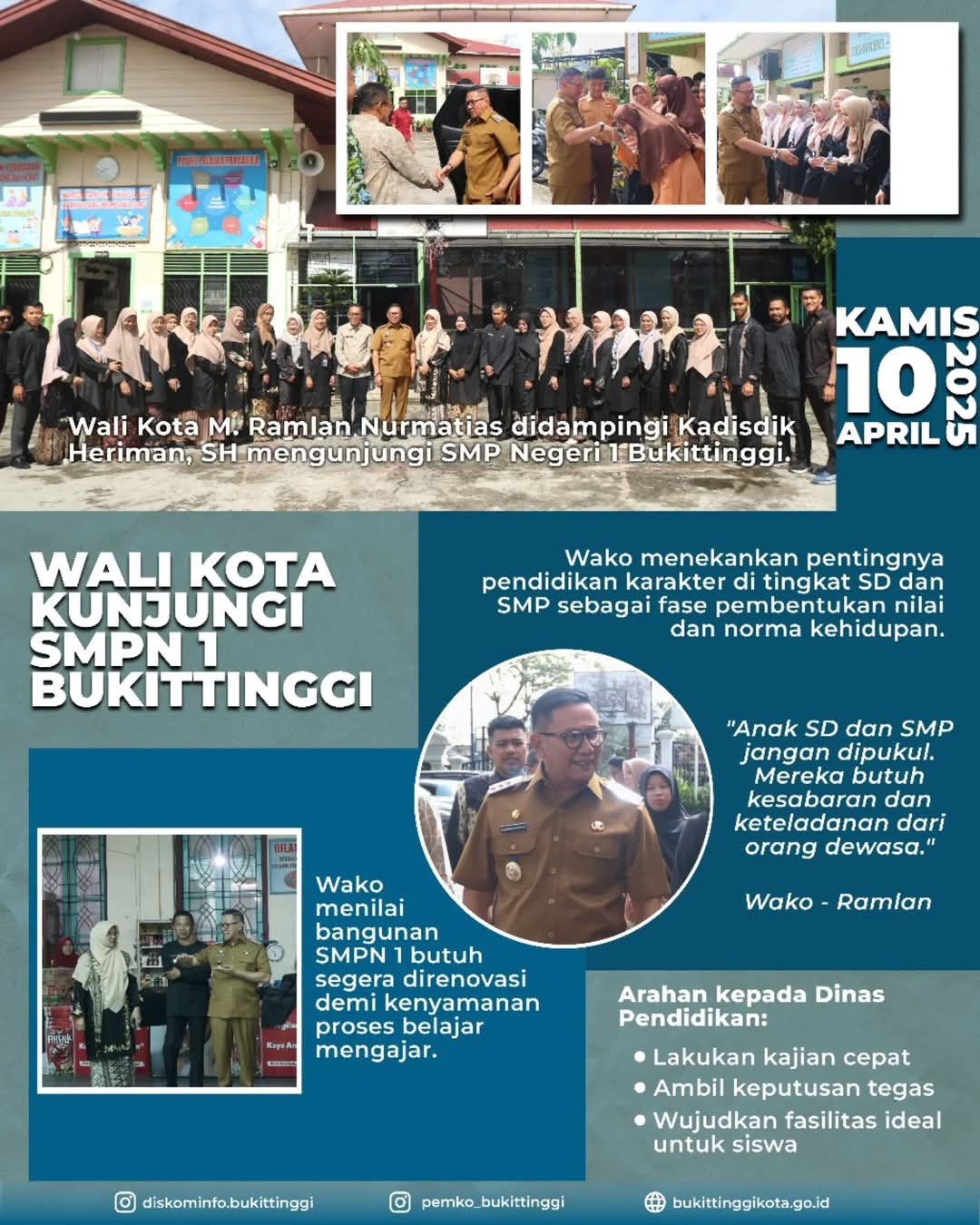 Bukittinggi,Infosumbar24.com |Wali Kota Bukittinggi M. Ramlan Nurmatias, SH., didampingi Kepala Dinas Pendidikan Heriman, SH. mengunjungi SMP Negeri 1, Kamis, 10 April 2025.